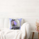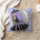 Purple witch flying on a full moon. The illustration features a witch with purple hair and heels. The design also features a grey silver full moon and stars. Cute witchy pillow for Halloween home decor. Add this design to your witchy Halloween decorations. Great pillow design to give to sisters, friends, or girlfriends during the month of October.