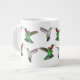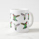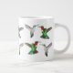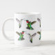 Orignal fine art design of flying male and female Ruby Throated Hummingbirds by nature artist Carolyn McFann of Two Purring Cats Studio printed on a dishwasher and microwave safe jumbo-sized mug for wild bird fans.