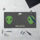 A Desk Mat for those who believe or science fiction fan. It is decorated with two green aliens, a flying saucer and a customisable message "Believe"! Perfect gift for a geek or for an office decoration in space theme!