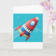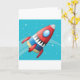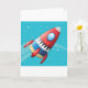 Dreaming of flying through space in a spaceship. Well then this design will answer that dream. It is off a colourful spaceship that is zipping through space. The rocket is is multicolored and has a vapour trail out the back. It is set against a blue background. This flying spaceship design looks great on these greeting cards