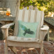 This decorative pillow in outdoor fabric has a flying transparent black bird against a green background with leaves and tree tops with the birds wings spread in flight on the front and back.