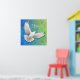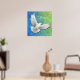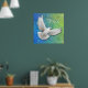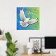 Original fine art design of a flying white peace dove against a pretty blue green background by artist Carolyn McFann of Two Purring Cats Studio printed on a quality poster print.