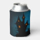 a witch flying on her broomstick past the full moon with a dark house in the background and a cat on the fence