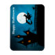 a witch flying on her broomstick past the full moon with a dark house in the background and a cat on the fence