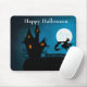 a witch flying on her broomstick past the full moon with a dark house in the background and a cat on the fence