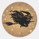 Black silhouette of a witch flying through the night on her broom. Some designs have more than one witch flying as if they are in formation. Some have an orangy-gold background with stars.