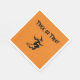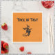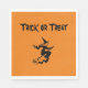 Paper TRICK OR TREAT napkins on a pumpkin coloured background with a scary flying witch! Add some Halloween spice to your table/gathering with these cute and festive napkins.