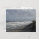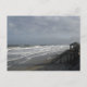 Waves roll to the shore during high tide. The sun on the waves contrasts with the foreboding sky.