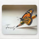 A vibrant monarch butterfly gracefully resting on a pencil, magically suspended above a blank sheet of paper with one inspiring word.