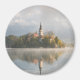 Round photo magnet of a foggy sunrise at Bled Lake with the island with church and mist with reflection in the water in the first sunlight of the morning in Slovenia.