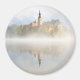 Round photo magnet with a foggy sunrise at Lake Bled with reflection of the island with the church in the still water of the lake and with Bled Castle in the background on a beautiful autumn day in Slovenia.