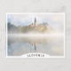 Photo postcard of a foggy sunrise at Lake Bled with reflection of the island with the church in the still water of the lake and with Bled Castle in the background on a beautiful autumn day in Slovenia with a white edge and the curved text 'Slovenia'.
