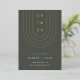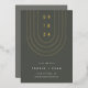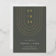A simple and elegant save the date design for modern couples, featuring an inverted gold foil arch bearing your wedding date on a deep smoked olive green background. Personalise with your names, wedding location, and website or additional details at the bottom.