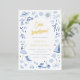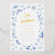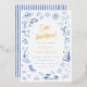 Ciao baby! Give your baby shower invitations a shine with real gold, silver, or rose gold foil. This blue baby shower invitation features a frame of watercolor Italian summer elements. The hand-painted frame includes lemons, tomatoes, seashells, starfish, a Vespa, a hat and sunglasses, a sailboat, gelato, a beach umbrella, and other Mediterranean illustrations detailed with real foil. Ideal for an Italian-themed summer baby shower. Cards reverse to a pattern of vintage stripes in navy blue against a baby blue background. View the collection linked on this page for matching items or visit our store for more boy baby shower invitations.