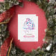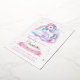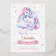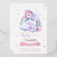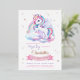 Foil Invitation to a magical birthday party with an adorable unicorn with wings in the clouds on a rainbow background.
