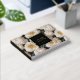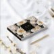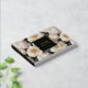 A simple yet eye-catching elegant seamless pattern featuring large ivory white rose flowers in full bloom with pale peach stamens set against a deep green leaf background that has a square black inlay edged with real gold foil. Three text templates for your custom wording appear on the inlay on the front cover and the spine has a template for your personalised heading. All the text templates are real foil creating a timeless and luxury look to the cover.