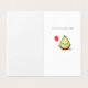 A little avocado holding a little red balloon. The avocado has a cute little face on it.