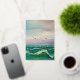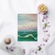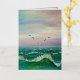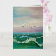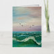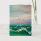 A serene painting of the sea captures the rhythmic movement of waves, rolling gently yet powerfully under a vast sky. White-tipped waves crest along the deep blue water, each one reflecting a touch of sunlight. In the foreground, seagulls glide gracefully over the water, their wings spread wide, casting delicate shadows on the waves below. The horizon stretches endlessly, blending soft hues of sky and sea, creating a feeling of openness and freedom. The scene is peaceful yet alive with the sound of waves and the distant calls of the seabirds.