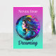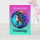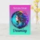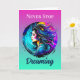 Pretty woman with blue, turquoise, blue, yellow and red colourful ai art done in a mystical ethereal surreal vibe. Inspirational quote, "Never Stop Dreaming."