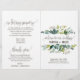 This foliage wedding program is perfect for a rustic wedding. The design features a boho frame of green leaves and leafy greenery botanicals. Include the name of the bride and groom, the wedding date and location, thank you message, order of service, bridal party and an "in loving memory" memorial.