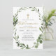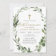Invite your guest with our elegant and modern greenery eucalyptus first communion invitation features watercolor greenery eucalyptus wreath. Personalise with your event details in simple layout and elegant handwritten style font.