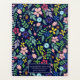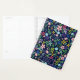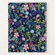 Floral with floating foliage, pretty stylised flowers, leaves, berries, acorns and accent polka dots in shades of green, blue, pink, purple and yellow with accents in orange, red and brown. Set on dark midnight express blue. Image is placed on both sides of product. Use the templates to personalise with your name or message in pale pink font on a dark blue nameplate framed in pink.