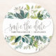 This foliage wedding save the date announcement coaster is perfect for a rustic wedding. The design features a boho frame of green leaves and leafy greenery botanicals.
