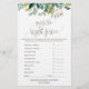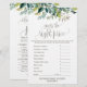 This foliage "what's in your phone" game is perfect for a rustic baby shower. The front of the game card features "guess the right price", and the back of the card features "what's in your phone". The design features a boho frame of green leaves and leafy greenery botanicals. Personalise the front of the card with the name of the mum-to-be and baby shower date. You can personalise the game questions by clicking the "customise" button.