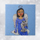 This ceramic tile has a pretty folk art angel with black hair and blue eyes wearing a blue dress with white stars hold her white and grey angel cat on her lap sitting on a white puffy cloud in a light blue sky.