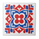 A striking red blue and white tile featuring a symmetrical floral motif framed by bold geometric shapes. At the center, a four-petal bloom anchors the design, surrounded by angular curves, teardrop accents, and mirrored heart-like forms. The high-contrast palette and rhythmic layout evoke both mid-century modern and folk-art sensibilities, creating a timeless visual emblem with sculptural clarity and ornamental depth.