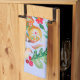 A cheerful folk art themed kitchen towel featuring a hand painted folk art inspired design of flowers, leaves and little pastel creatures