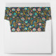 This folk art design features a pink, orange and teal floral pattern on a dark blue background.