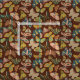 This patterned fabric features illustrations of moths in a modern folk art style. The print features moths in shades of pink, blue, green, yellow and tan against a warm and earthy brown background.
