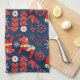 Folk Art Red Swedish Dala Horse Floral On Blue Tea Towel