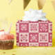 A chequered pattern of deep magenta and pale pink features a folk-art inspired heart motif with a stencil style design.