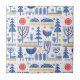 This folk art design features a woodland winter scene with birds, snowflakes and trees.