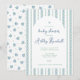 A sweet baby shower invitation featuring a Scandinavian style folk floral vertical stripe in blues and green on a white background. The back of the card has a coordinating ditsy floral print. All fields editable. Available in other colour options.