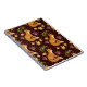 A charming pattern of seated orange foxes surrounded by yellow and purple flowers, green leaves, and dotted accents on a rich burgundy background.