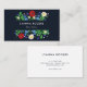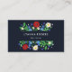 Dark blue business card for an interior designer, event stylist, makeup artist, hair stylist, or similar, featuring summer flowers against a dark blue background. Poppies, oxeye daisies, forget-me-nots, and elm leaves.