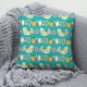 Colourful Mexican folk art style throw pillow pattern features white birds and other traditional elements on turquoise background