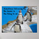 Digital photography of 3 penguins toddling along a walkway in their zoo habitat. With the caption: "Sometimes following the leader is the thing to do!"