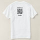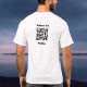 T-shirt for a business which has the QR Code on the front, and also a Follow Us Online Message with QR Code on the back. Shows QR Code for customers, visitors, and tourists etc., on both front and back. There are various websites that allow you to create and download QR Codes free. QR Codes can be created for websites, emails, Wifi, Vcards, and many other uses. One example is https://www.qr-code-generator.com