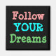 Colourful magnet with quote that reads, Follow Your Dreams.