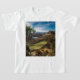 100% cotton so perfect for summer, It is a nicely designed t-shirt, the fabric is soft and the seams finished well, the body of the t shirt has no side seams. I bought a medium size for my two grandsons, aged 9 and 8 it will be slightly big on them but I would rather that than too small
