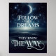 Poster with the affirmation "Follow your dreams, they know the way" over an aerial view of the Earth at night with a crescent moon and stars