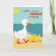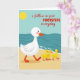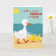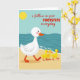 This card shows a calm beach scene where a large white waterfowl with rosy cheeks, an orange beak, and orange webbed feet walks across warm golden sand from left to right. Close behind, three small yellow chicks trail in a neat line, leaning towards the leader with an affectionate, trusting closeness ❤️. In the upper left, a round yellow sun sits against a soft blue sky that fades towards a deep teal ocean. Along the shoreline, simple wave shapes roll in with thin white foam marks, giving the water a gentle, steady rhythm. Across the middle, red lettering reads “i follow in your FOOTSTEPS everyday,” with “FOOTSTEPS” in all caps and the rest in lowercase for contrast. The text sits over the scene without covering the birds, letting the procession stay front and centre 🌼. The ocean is drawn in layered teal curves with small white highlights where the waves meet the sand.