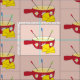 A fun fabric with the pattern of a fondue pot and two piece of Swiss cheese .