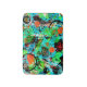 A lively abstract in shades of turquoise, teal, orange, red orange, black, white, metallic gold and shades of green.