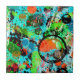 A lively abstract in shades of turquoise, teal, orange, red orange, black, white, metallic gold and green.