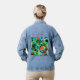 A lively abstract in shades of turquoise, teal, orange, red orange, black, white, metallic gold and green adorns this denim jacket.